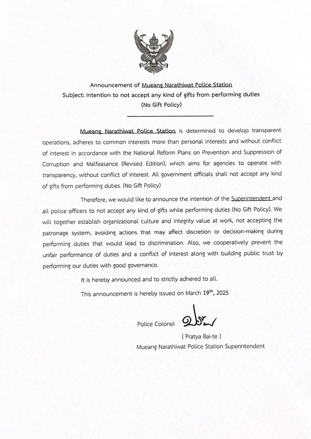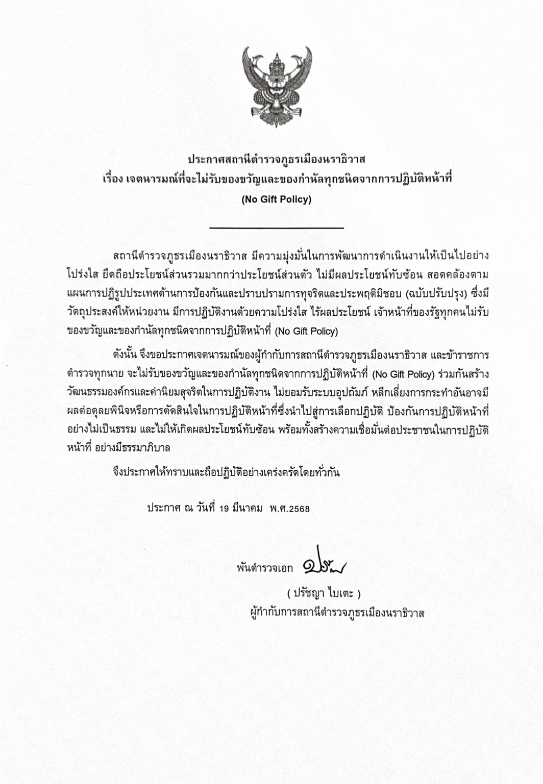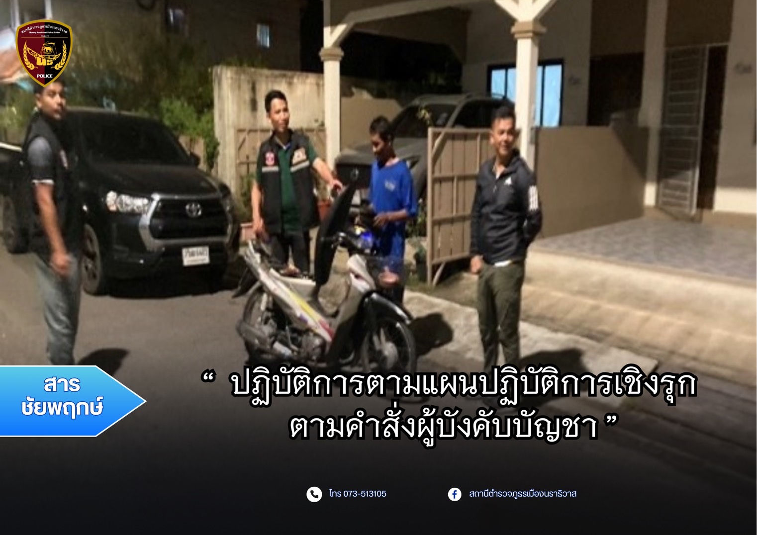 เมื่อวันที่ 5 เมษายน 2568 เวลา 09.00 น. พันตำรวจเอก ปรัชญา ไบเตะ ผู้กำกับการสถานีตำรวจภูธรเมืองนราธิ