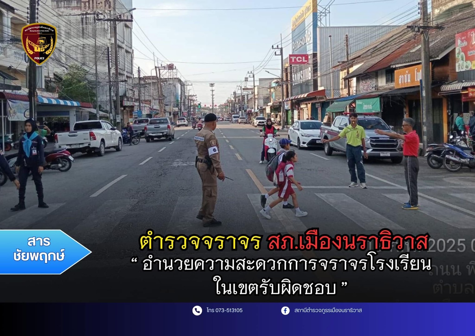 อำนวยความสะดวกการจราจรโรงเรียนในเขตเทศบาล เมื่อวันที่ 19 กุมภาพันธ์ 2568 เวลา 07.30 น. ร.ต.ท.จิตรภาณ