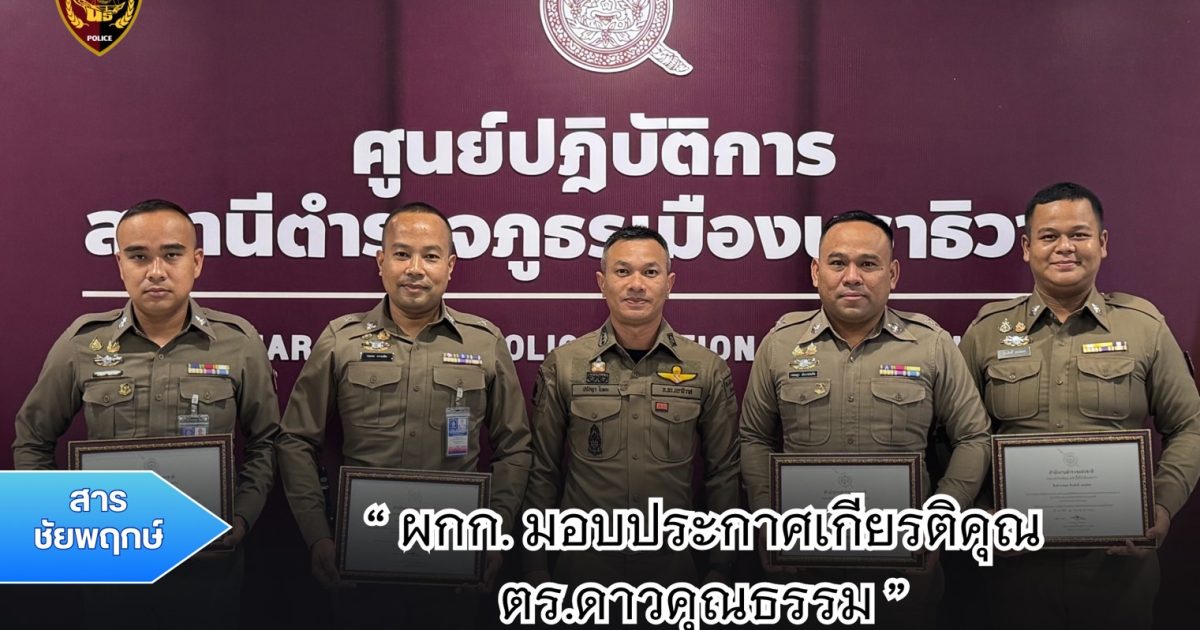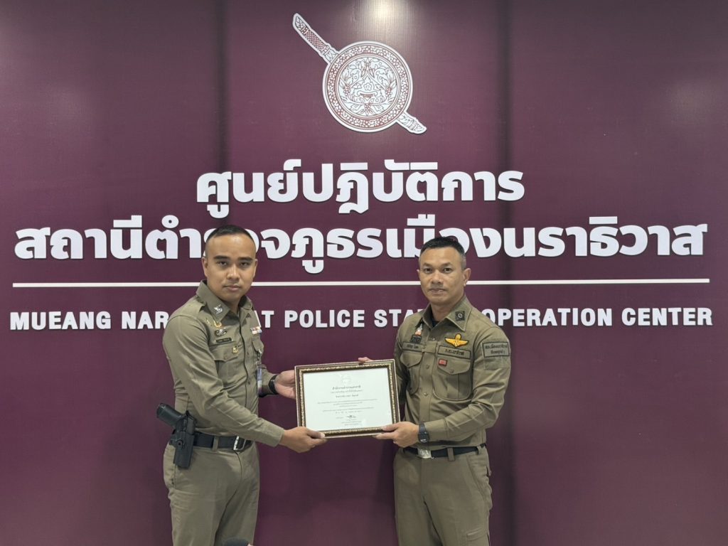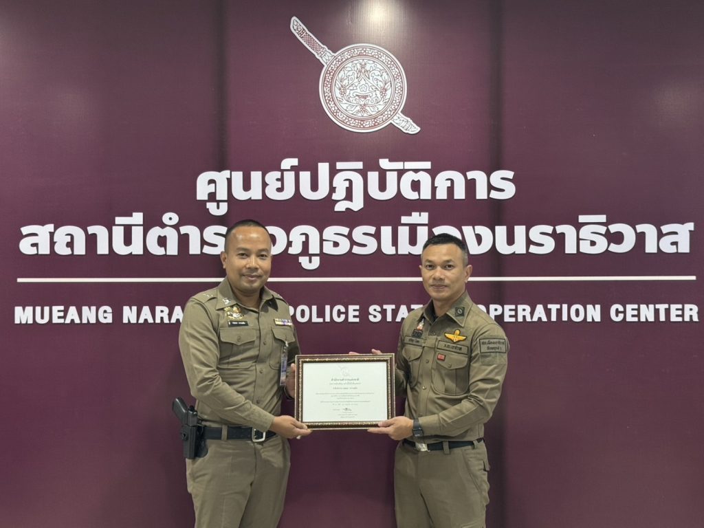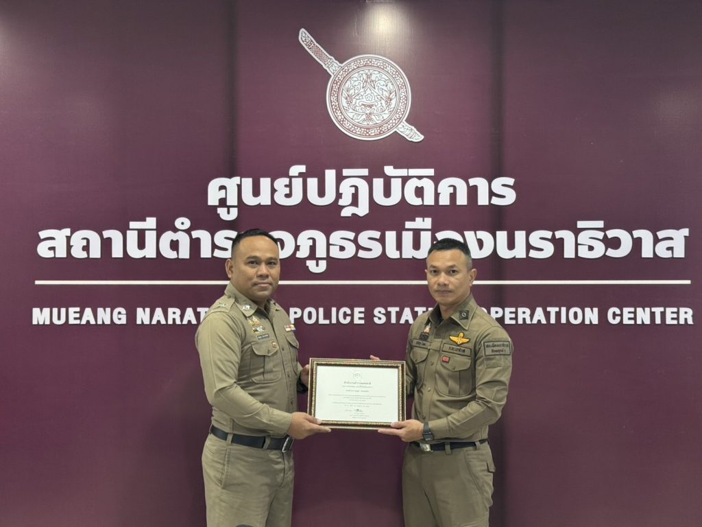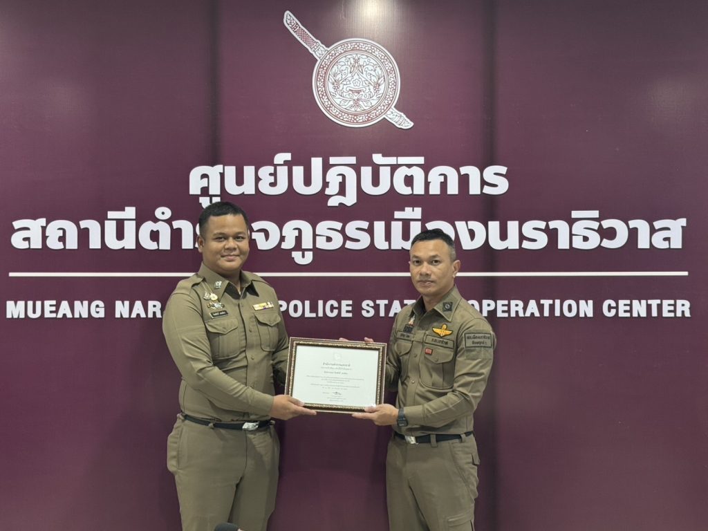 พ.ต.อ.ปรัชญา ไบเตะ ผกก.สภ.เมืองนราธิวาส ได้มอบประกาศเกียรติคุณ ให้แก่ ตร.ดาวคุณธรรม